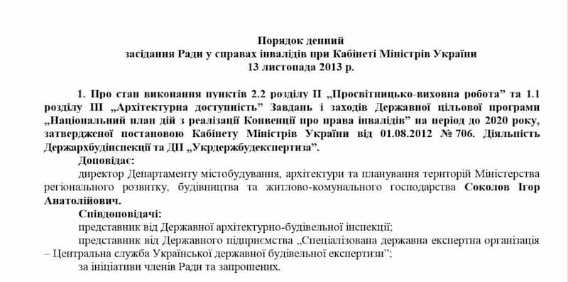 1. Про стан виконання пунктів 2.2 розділу ІІ „Просвітницько-виховна робота” та 1.1 розділу ІІІ „Архітектурна доступність” Завдань і заходів Державної цільової програми „Національний план дій з реалізації Конвенції про правалюдей з інвалідністю” на період до 2020 року, затвердженої постановою Кабінету Міністрів України від 01.08.2012 № 706. Діяльність Держархбудінспекції та ДП „Укрдержбудекспертиза”.